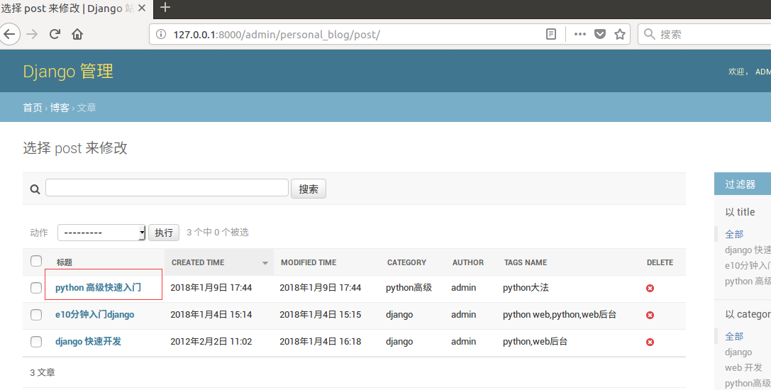 <QuerySet [<Post: python 高级快速入门>, <Post: django 快速开发>]>